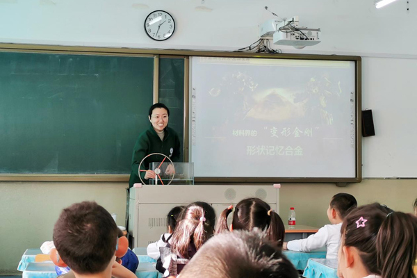 在岐山一校,張慧博副研究員為同學們作了題為《材料界的“變形金剛”》的科普報告。通過展示在熱水中不需任何動力即可自由轉動的“小摩天輪”,張老師引導同學們觀察、思考其工作原理。隨后介紹了形狀記憶合金的基本原理,并結合互動小實驗加深理解,充分激發了同學們對科學的興趣,在孩子們心中埋下了科學的種子