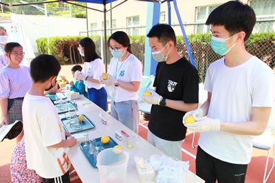 在“妙趣小實驗”環節,設置了8個與日常生活相關的創意小實驗,包括 “變廢為寶育蘑菇”“這種蛋白質很神秘”“細菌吐‘絲’用處大”“神奇火旋風”“會畫畫的茶皂素”“泡泡的秘密”“真菌無處不在”“用‘光’抓住小細胞” ?;顒又驹刚邆兓砜茖W主播,講解和動手展示結合將科學知識傳遞給公眾,直觀形象、生動有趣。來參觀的學生們通過動手實驗,在“玩”的過程中學到了課堂上、書本里所學不到的科學知識,親身體會科學的神奇,開闊了眼界,激發了探索科學奧秘的興趣。