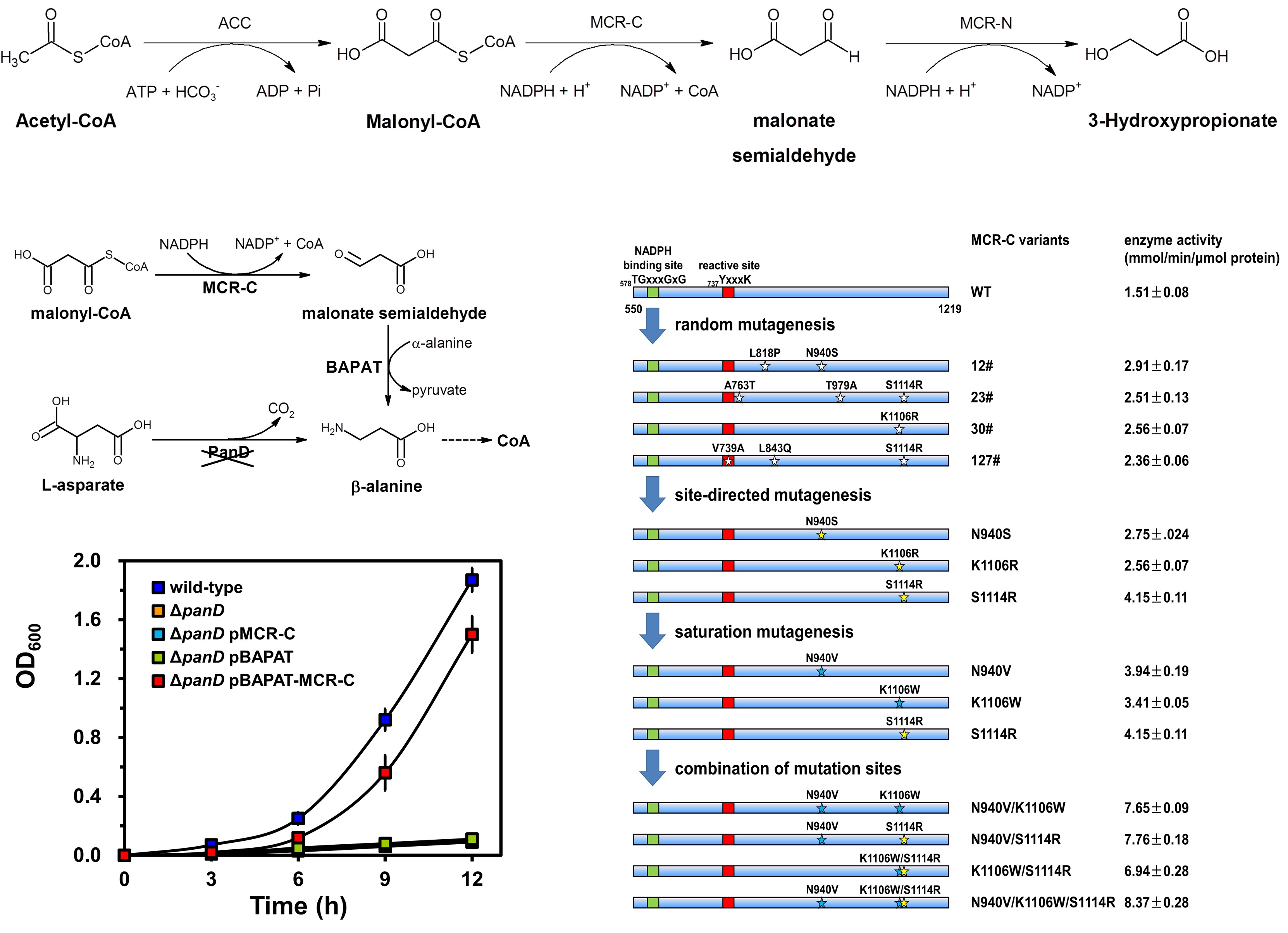 來源于嗜熱自養型古細菌Chloroflexus aurantiacus的雙功能酶——丙二酸單酰輔酶A還原酶(MCR)是3-羥基丙酸合成新途徑中的關鍵酶,自身具有醛脫氫酶和醇脫氫酶的功能,催化兩步反應,將脂肪酸合成的前體物質丙二酸單酰輔酶A 經中間體丙二酸半醛轉化為3-羥基丙酸??蒲腥藛T通過對該蛋白序列的分析,將MCR蛋白成功拆分為MCR-C和MCR-N兩部分,每個部分可獨立催化一步反應。更為重要的是,拆分后的蛋白對底物丙二酸單酰輔酶A有著更高的親和力,酶活力遠高于野生型MCR,同時3-羥基丙酸產量也得到了一定提高。以往的代謝工程中,將催化相鄰反應的酶構建融合蛋白來提高催化效率是一種常用方法,而我們的研究提出了拆分多功能域蛋白以提高催化能力和產品產量的新思路,對更好的利用功能蛋白尤其是多功能酶類具有普遍的參考價值。