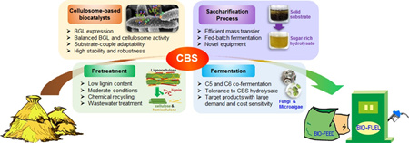 CBS工藝以可發酵糖作為產品,因此,使可發酵糖的生產成本低于淀粉糖成本,是將基于CBS工藝的木質纖維素生物轉化技術應用于實際工業生產的前提。為此,該論文中詳細討論了未來進一步提高CBS糖化效率和糖產量的研究方向以及在CBS生物催化劑和工藝的優化方面需要解決的關鍵問題,包括提高CBS全菌催化劑對預處理衍生的抑制物的耐受性、優化纖維小體中不同功能組分的活力平衡、研制新工藝和配套裝備提高糖化的傳質效率以提高底物載量、提高預處理方法和下游應用技術與CBS工藝的兼容性等(圖2)。