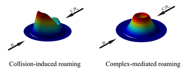 漫游機理是反應動力學中的一種新的反應機理,與常規的經過最小反應能量途徑產生的機理不同。盡管漫游機理已經在單分子解離反應中被發現和報道,但是很少有關于雙分子碰撞反應的研究。在該研究中,研究人員針對重要的雙分子燃燒反應H+C2H4