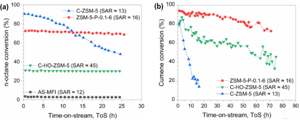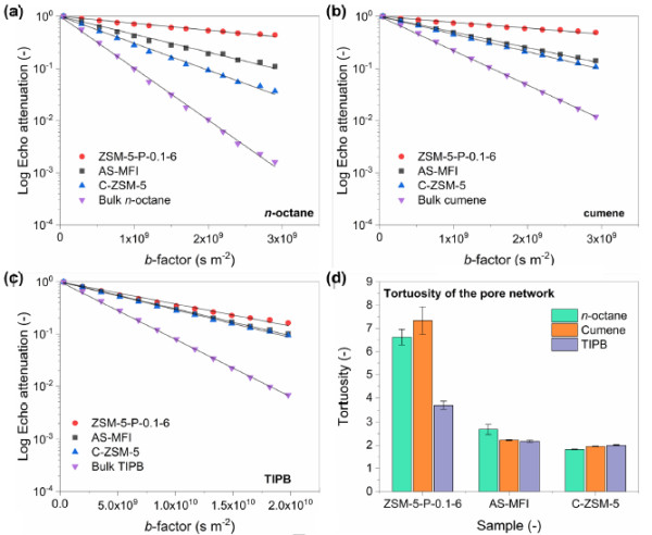 此項研究通過高溫快速老化沸石合成母液制備出含有非骨架鋁的沸石母相,而后,通過四丙基氫氧化銨溶解、再結晶將非骨架鋁轉化為骨架鋁,同時形成中空結構。該方法的新穎性在于,采用含有非骨架鋁的沸石作為母相,打破了四配位骨架鋁對沸石溶解、再結晶的限制,從而制備出硅鋁比低至16的中空ZSM-5型沸石。低硅鋁比中空ZSM-5型沸石在碳氫化合物裂解中,尤其是在大分子碳氫化合物裂解中表現出高活性、高穩定性和高丙烯選擇性的顯著優勢。通過脈沖場梯度核磁共振(PFG-NMR)研究了沸石催化劑的傳質特性,表明低硅鋁比中空ZSM-5型沸石優異的催化性能來源于大量的可接觸酸性位。該方法不僅適用于合成低硅鋁比中空ZSM-5型沸石,也為其它中空雜原子摻雜沸石合成提供了可行的技術路線。