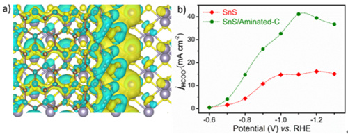 圖(a)SnS/Aminated-C復合催化劑的差分電荷分布圖;(b)CO2RR活性電流密度對比圖