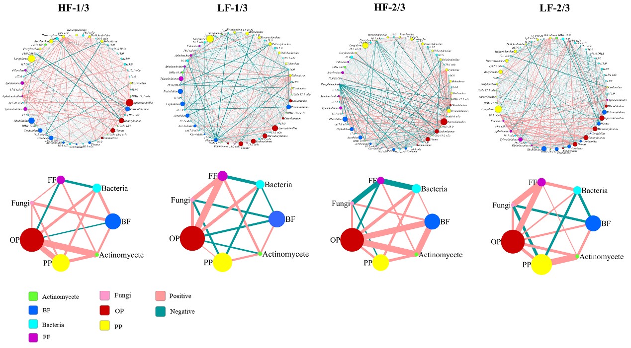 圖2. 不同秸稈還田量及頻率方式下土壤微食物網間的網絡分析。紅色和藍色的線分別代表正相關和負相關關系,點的大小代表生物量的多少