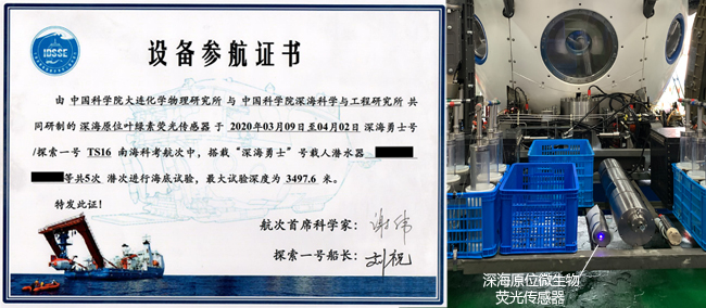 該系列傳感器包括深海原位葉綠素熒光傳感器、深海原位微生物熒光傳感器和深海原位多環芳烴熒光傳感器。此前,經深海所測試,此三種傳感器均通過凈水壓力試驗,最大工作深度均為4500米。本航次海試過程中,深海原位葉綠素熒光傳感器共進行5潛次海底試驗,最大試驗深度為3497.6米;深海原位多環芳烴熒光傳感器共進行3潛次海底試驗,最大試驗深度為3340.0米;深海原位微生物熒光傳感器共進行3潛次海底試驗,最大試驗深度為2371.4米。該系列傳感器分別測量了南海海水中從海平面到海底整個剖面的葉綠素a、微生物和多環芳烴的濃度。原位探測深海中葉綠素a的濃度,反映了深海中浮游植物生物量或現存量,是計算初級生產力的基礎。原位探測深海中微生物的濃度,具有很高的科學研究價值和衍生的經濟價值。原位探測深海中多環芳烴的濃度,有助于勘探海底原油溢油,具有重要的能源勘探價值。此次勘探所得數據為海洋生物、物理海洋等多學科研究提供了重要的原始數據。該系列儀器均屬我國首套該類型的深海原位熒光傳感器。其中,深海原位微生物熒光傳感器也是國際首套該類型儀器。