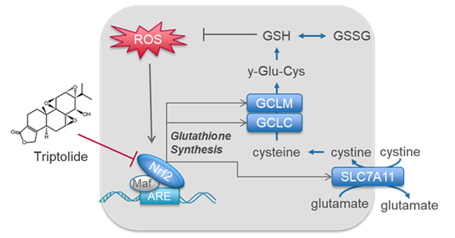 雷公藤甲素(Triptolide)是從雷公藤中提取的一種二萜環氧化合物,是高效的Nrf2抑制劑。在體外和體內模型中發現,雷公藤甲素干預的IDH1突變膠質瘤細胞中,Nrf2的轉錄活性被抑制,GCLC、GCLM和SLC7A11的表達下調,從而破壞了谷胱甘肽的代謝,細胞內的氧化損傷增加,導致細胞凋亡。該研究闡述了抑制Nrf2調控的谷胱甘肽代謝通路對腫瘤治療的重要性,同時為治療IDH1突變的惡性腫瘤提供了一種新的思路。
