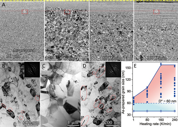 圖1. 快速加熱穩定納米晶銅。(A)制備態樣品及分別以不同升溫速率(1,80,160K/min)加熱至523K的樣品的表層梯度納米結構的典型橫截面掃描電鏡照片。(B-D)制備態樣品及不同升溫速率加熱處理后的樣品中距表面~25 m深度處納米晶典型透射照片(對應深度如圖A中虛線框所示,該深度處制備態樣品平均晶粒尺寸約為80nm)。(E)以不同升溫速率加熱至523K處理后的樣品中表層穩定納米晶對應晶粒尺寸范圍。圖中實心和空心圓點分別代表實驗觀察到穩定納米晶層的上下界所對應晶粒尺寸,虛線表示制備態樣品在523K熱處理時穩定納米晶的平均晶粒尺寸上界(D*~60nm),誤差棒指平均晶粒尺寸的統計標準誤差。