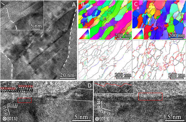 圖2. 快速加熱后納米晶內部形成大量孿晶且晶界平面化。(A)圖1D中所示區域內納米晶的典型高分辨照片,左上角插圖為晶粒中納米孿晶的原子像圖片。(B, C)制備態樣品和以160K/min升溫速率加熱至523K處理后樣品中典型晶界特征分布。不同顏色代表不同類型晶界,紅色為孿晶界,灰色為小角晶界,黑色為普通大角晶界,其他顏色為其他特殊重位點陣界面( < 29)。(D, E)圖1D所示區域內的典型晶界高分辨照片,左上角插圖為紅色實線框放大圖。