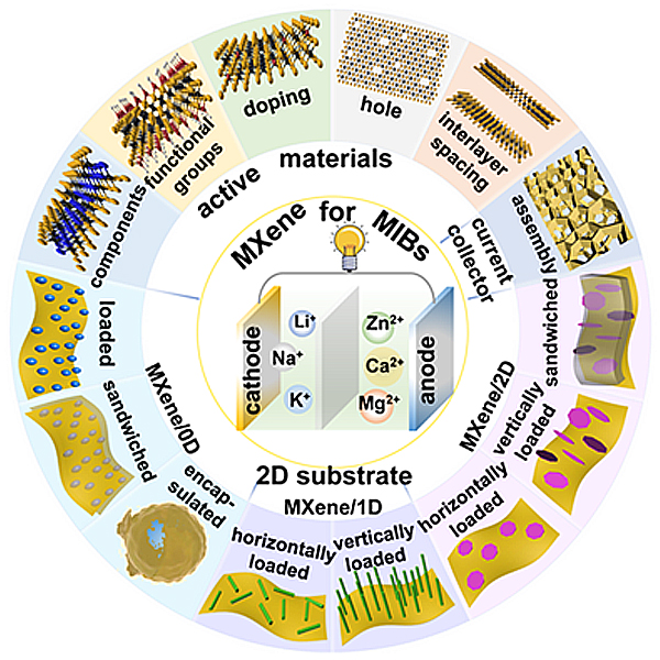 基于前期研究基礎,該團隊系統地綜述了MXene基納米結構在高性能金屬(鋰、鈉、鉀、鎂、鋅、鈣)離子電池的研究進展和未來的發展方向??偨Y了MXene材料在金屬離子電池中可以扮演活性電極材料、導電載體和集流體三種重要角色,詳細闡述了MXene基不同維數(0維、1維和2維)納米活性電極材料及其三種復合模型,包括負載型、包覆型和三明治型;重點綜述了不同MXene復合材料應用于不同種類金屬離子電池中的優缺點及其構效關系,強調了MXene和活性材料的強耦合復合界面構筑以及協同耦合增強電池性能的內在機制;簡要討論了MXene基納米結構在高性能金屬離子電池應用方面所面臨的挑戰與發展機遇,并提出了一些解決方案和未來的發展方向。