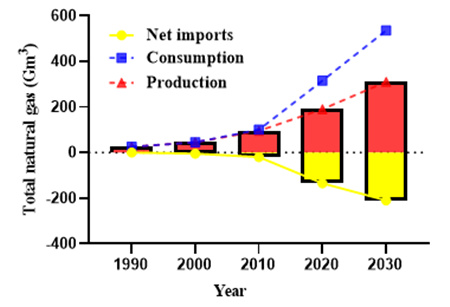 圖1 2018年我國天然氣消耗總量為283 Gm3,進口125 Gm3,至2020年需求將超過300 Gm3 /year。