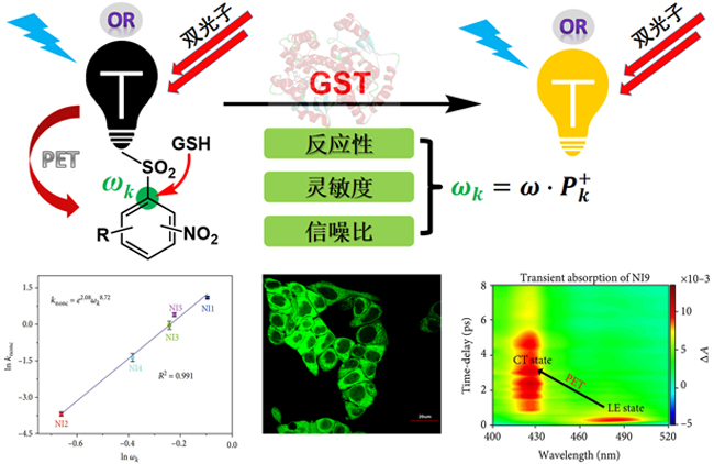 GST作為II期解毒酶,能夠催化谷胱甘肽(GSH)的巰基親核進攻親電性或疏水性物質,以實現其生理功能。它的多種亞型同工酶在許多腫瘤細胞系尤其是抗癌藥耐藥性細胞系中過表達,因而高信噪比檢測GST對于癌癥的早期診斷和治療具有重要的意義。之前報道的GST熒光探針多采用2,4-二硝基苯磺?;鳛樽R別和反應基團,該基團雖能保證極高的靈敏度,但同時會帶來嚴重的背景噪音。這是由該基團對GSH可觀的非酶促化學反應活性導致的。為了得到高性能的實用型GST熒光探針,需要降低識別基團的背景反應噪音。然而,靈敏度與背景噪音往往是相互制衡的一對因素,因此,對反應活性的微調是找準平衡點的關鍵。
