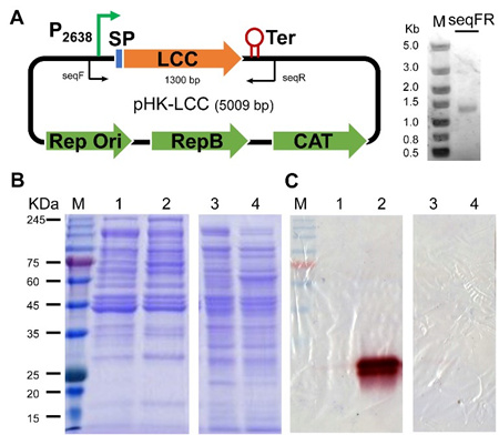圖1 PET降解嗜熱全菌催化劑的構建及LCC活性分析