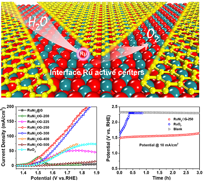 鄧德會團隊在長期深入研究二維材料限域過渡金屬催化電解水的基礎上(Angew. Chem. Int. Ed., 2020, doi: 10.1002/anie.202003484; Nano Energy, 2020, 72, 104700; Nano Energy, 2019, 61, 611; Nano Energy, 2018, 52, 494; Nat. Commun., 2017, 8, 14430; Energy Environ. Sci., 2016, 9, 123; Angew. Chem. Int. Ed., 2015, 54, 2100; Energy Environ. Sci., 2015, 8, 1594; Energy Environ. Sci., 2014, 7, 1919),通過精確構筑RuO2和石墨烯的界面來提升RuO2基催化劑在酸性電解水析氧反應中的活性和穩定性?;谠摬呗运苽涞拇呋瘎┍憩F出優于商品RuO2的電催化活性和穩定性,在10 mA cm-2電流密度下,過電位僅為227 mV,低于商品RuO2所需的290 mV過電位,可以穩定運行超過24小時,其穩定性遠高于商品RuO2催化劑。同時,該團隊與中科院山西煤炭化學研究所的任鵬舉博士合作,結合密度泛函理論計算發現,RuO2和石墨烯界面上的Ru位點可以打破吸附態物種HOO*和HO*之間的線性關系,降低整個反應決速步的反應能壘,進而提高電解水析氧的反應活性。此外,石墨烯向RuO2表面轉移的電子可以提高RuO2的抗氧化和抗腐蝕能力。因此,石墨烯和RuO2界面處的Ru中心不僅可以增強RuO2催化析氧反應的活性,而且可以有效提升其穩定性。