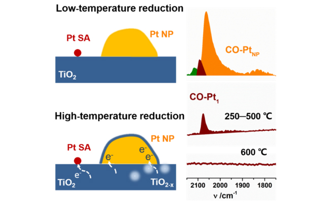 近日,大連化物所催化與新材料研究室喬波濤研究員和張濤院士團隊在單原子金屬-載體強相互作用研究方面取得新進展,首次發現Pt單原子能夠與TiO2載體間發生經典金屬-載體強相互作用(Strong Metal-Support Interaction, SMSI),但其所需發生溫度較Pt NPs更高,且Pt單原子失去CO吸附能力的原因與Pt NPs不同,不是載體的物理覆蓋,而是配位飽和。