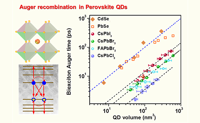 在近期工作中,該團隊基于尺寸及組分可調的一系列鉛鹵素鈣鈦礦QD樣品,系統研究了鈣鈦礦QD的雙激子俄歇復合動力學。作為一種超快的非輻射復合方式,俄歇復合對于QD在激光器、發光二極管及光伏器件中的應用具有重要影響。因此,有必要測量和理解鈣鈦礦QD的俄歇復合動力學。該團隊研究發現,鈣鈦礦QD的俄歇壽命呈現出對QD體積的線性依賴關系,且俄歇壽命與A位陽離子組分基本無關,但對陰離子組分敏感依賴。此外,所有鈣鈦礦QD的俄歇壽命都顯著短于傳統的CdSe和PbSe等QD材料。該團隊基于帶間躍遷幾率和能帶結構等物理參數對觀測到的壽命規律給出了半定量解釋。這些俄歇壽命的定標規律(scaling law)為鈣鈦礦QD的器件應用提供了重要的參考價值。