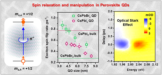 近日,大連化物所分子反應動力學國家重點實驗室光電材料動力學創新特區研究組(11T6組)吳凱豐研究員團隊采用飛秒瞬態光譜技術,系統地研究了鈣鈦礦量子點體系的激子復合與自旋動力學,揭示了量子點尺寸與組分對俄歇復合和自旋馳豫壽命的影響,并基于光學斯塔克效應實現了對自旋態能量的操縱,對理解鈣鈦礦量子點的基本光物理及其在光電和量子器件方面的應用具有重要意義。