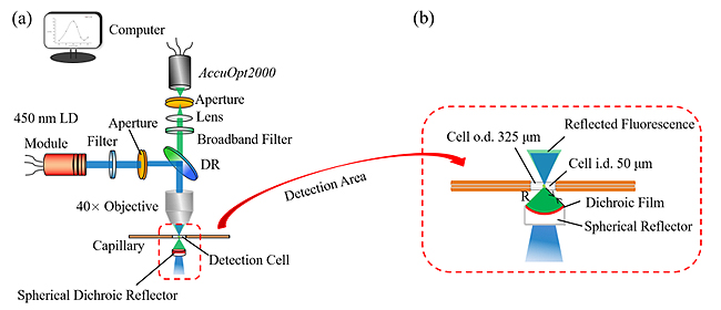 (a) 激光誘導熒光檢測器原理圖;(b)放大的球面二向色反光鏡原理圖