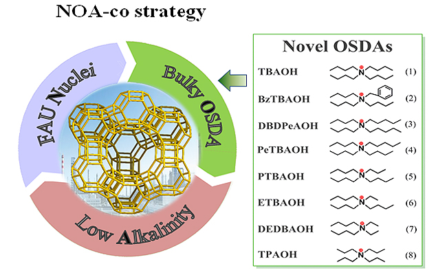該項研究中,研究團隊提出高硅Y沸石的合成新策略(NOA-co策略),在高分散的FAU晶核溶液、較大體積的有機模板劑、低堿度的合成凝膠三者協同作用下實現了其直接合成?;贜OA-co策略,研究團隊發現多種高效合成高硅Y沸石的有機模板劑,并對晶化機理進行了探討。