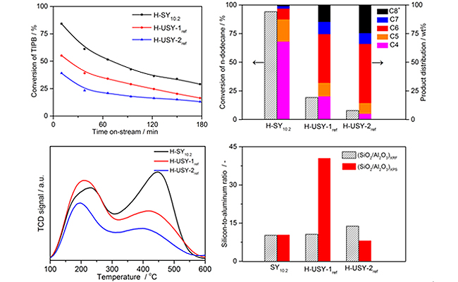NOA-co策略合成的高硅Y沸石的粒徑尺寸為100至250 nm,具有高的結晶度、優異的熱/水熱穩定性。與后處理法所得的高硅Y沸石相比,NOA-co策略直接合成的材料具有更多的強酸中心,且酸中心分布相對均勻,在大分子原料的裂化反應中表現出優異的催化活性。NOA-co策略的提出為高硅沸石的合成提供了研究新思路。