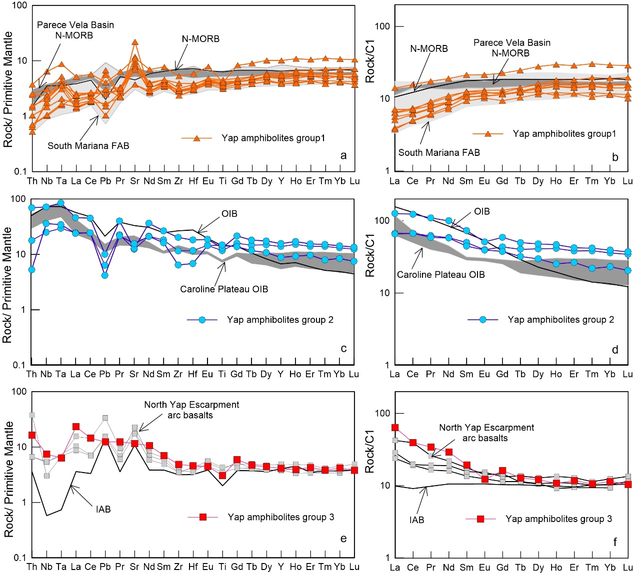 針對以上問題,中國科學院海洋研究所張國良研究員指導博士研究生,利用“科學”號科考船在雅浦島弧獲取的基巖,開展了一系列詳細的礦物學、年代學和地球化學研究(全巖主微量元素和Sr-Nd-Pb-Hf同位素等)。研究發現,所獲得的基巖均由角山巖相變質巖組成,首次通過角閃石40Ar/39Ar定年和離子探針(SIMS)進行榍石U-Pb定年,獲得了一致的年齡結果顯示雅浦島弧變質作用發生在約21 Ma(圖2)。地球化學的結果(圖3)將雅浦島弧變質巖分為三組:第一組具有極其虧損型微量元素模式和Dupal型同位素特征,推測來源于初始雅浦弧前玄武巖(FAB);第二組具有堿性洋島玄武巖的富集型微量元素特征和太平洋型地幔特征,推測來源于卡洛琳洋底高原的碰撞作用;第三組具有典型的成熟島弧火山巖微量元素特征,來源于原始雅浦島弧火山巖。