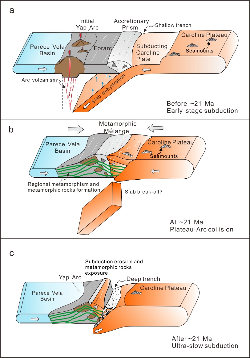 綜合研究認為,雅浦俯沖體系經歷了三個演化階段(圖4):卡洛琳板塊俯沖的早期階段(原雅浦島弧火山巖形成),原雅浦島弧與卡洛琳高原的碰撞階段(雅浦島弧變質巖形成),卡洛琳高原向雅浦海溝的超慢速俯沖階段(伴隨強烈俯沖侵蝕,以及年輕島弧火山巖的產生)。