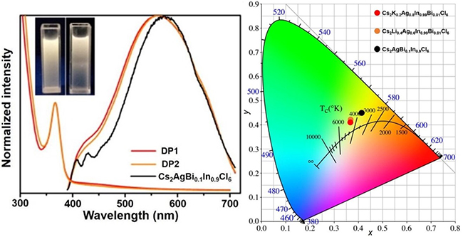 Cs2AgIn0.9Bi0.1Cl6、K+/Ag+、Li+/Ag+合金雙鈣鈦礦納米晶的熒光圖及色坐標圖