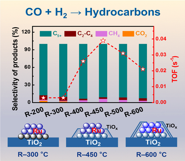 該團隊利用金紅石型RuO2與TiO2晶型相同、晶格匹配度高的特點,成功合成了高分散、高穩定的Ru/TiO2催化劑,其中Ru NPs粒徑僅為2 nm左右,經600 高溫還原處理后粒徑未發生明顯變化。該團隊通過改變催化劑的還原溫度,實現了金屬-載體強相互作用程度的可控調節,獲得了具有不同金屬-載體界面結構的Ru/TiO2催化劑。研究表明,在適宜的金屬-載體界面協同作用下,約2 nm的Ru NPs可以在溫和條件下(160 )表現出優異的費托反應活性,其TOF值是目前文獻報道的最高值。通過多種表征技術并結合理論計算發現:利用金屬-載體強相互作用形成的TiOx覆蓋層可直接參與C-O鍵的解離,從而顯著提高了Ru基催化劑的費托反應活性。本工作不僅揭示了金屬-載體強相互作用在費托合成反應中的催化作用機制,還為其他高分散金屬催化劑的設計提供了新思路。