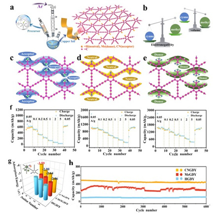 研究人員以石墨炔為例,使用化學修飾的前體通過交叉偶聯反應合成了一系列具有氫、甲基和氰基等不同功能基團修飾的石墨炔衍生物。不同功能基團的引入,引起包括能隙、層間距和微觀結構在內的特性發生了明顯的變化,進而顯著地影響到鋰離子電池的存儲容量。與石墨炔、氫修飾的石墨炔和甲基修飾的石墨炔相比,氰基修飾的石墨炔的電化學儲鋰性能提高最為顯著,在電流密度為50 mAg-1時,其可逆容量高達1612 mAhg-1。并且氰基修飾的石墨炔因其獨特的結構更有利于鋰離子在面內和面外的擴散與傳輸,這樣賦予其非常好的倍率性能及超高的穩定性能。該研究工作為精確調節碳材料的電子結構和性能提供了有效的策略,為石墨炔家族儲鋰性能研究以及探索新型碳素儲能材料提供了理論依據和實驗指導。