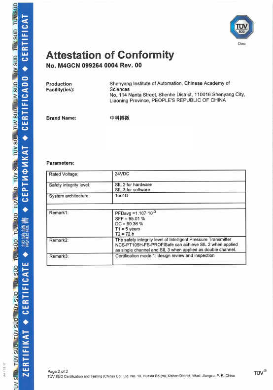 近日,中國科學院沈陽自動化研究所獲得了國際認證機構T V (南德意志大中華集團)頒發的總線型智能壓力變送器SIL2/3功能安全認證證書,這是我國首張總線型壓力變送器安全認證證書。此前,沈陽自動化所獲得了該機構頒發的智能溫度變送器SIL2/3功能安全認證證書。