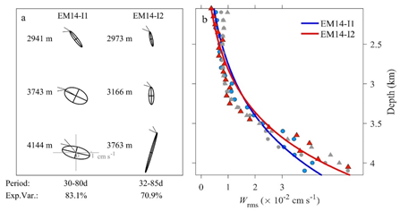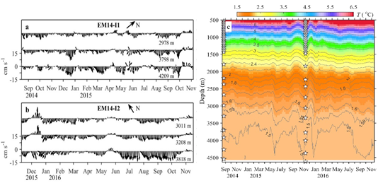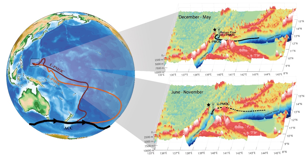 雅浦-馬里亞納海溝連接區是深層經向翻轉環流進入西太平洋的關鍵要塞通道,王凡研究團隊在這一區域開展了長期的潛標觀測?;谏鲜鰯祿?,團隊發現深層經向翻轉環流上下兩個分支(L-PMOC和U-PMOC)具有顯著的季節變化:位于通道西側3800-4200米北向的L-PMOC在12月至次年5月流速較強,可達20 cm s-1,6月至11月,流速較弱,且在通道東側4000米以深存在南向的L-PMOC回流,其具有和L-PMOC一樣的季節位相,但強度相對較弱;而位于通道東側3000-3800米南向的U-PMOC,其季節位相與L-PMOC相反,即12月至次年5月,流速較弱,6月至11月,流速較強。L-PMOC和U-PMOC的季節變化分別伴隨著上層繞極深層水(UCPW)和下層繞極深層水(LCPW)的季節性入侵。
