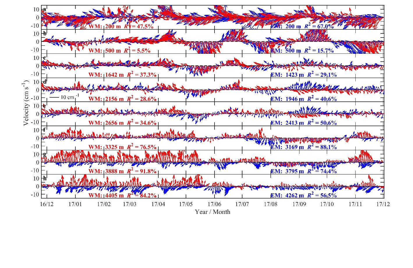 2016-2017年不同深度流速矢量的變化,其中藍色和紅色分別代表通道西側和東側潛標結果,數字表示流速矢量的平均深度以及經向流速年調和分析的解釋方差