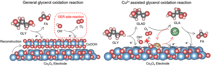 甘油氧化作為生物質平臺分子增值的重要途徑,其氧化產物廣泛應用于制藥、食品、化妝品和紡織等行業。然而,傳統熱催化甘油氧化過程依賴高溫高壓的反應條件,使用有毒氧化劑和溶劑,污染大、能耗高,限制了其可持續發展。面對國家“雙碳”戰略目標及綠色發展的迫切需求,電催化甘油氧化(GOR)技術應運而生。該技術以水為氧化劑,以綠色電能為能量輸入,不僅為甘油綠色氧化升級提供了新路徑,還可替代電解水制氫過程中的高能耗析氧反應,降低系統能耗,實現在生產高值化學品的同時高效制備綠氫,具有顯著的科學研究價值與應用前景。