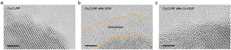 圖2. Cu2+抑制催化材料表面非晶化過程的TEM圖。(a) Co3O4的TEM圖;(b) 經過常規GOR反應后Co3O4的TEM圖;(c) 經過Cu-GOR反應后Co3O4的TEM圖。