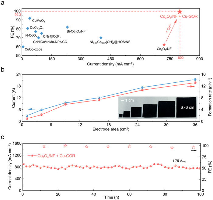 針對該挑戰,中國科學院金屬研究所太陽能與氫能材料研究團隊提出了一種通過引入Cu2+抑制過渡金屬氧化物表面非晶化的新策略(Cu-GOR)。相關研究結果表明,在電解液中添加微量Cu2+(相當于反應物濃度的1%),利用Cu2+/Cu+在電催化氧化過程中的可逆氧化還原,可有效維持催化材料晶體結構的穩定性,抑制過渡金屬氧化物催化材料的表面非晶化過程。以泡沫鎳負載Co3O4催化材料為例,在800 mA cm?2的工業級電流密度下,Cu2+的引入使目標產物甲酸的法拉第效率從62.2%提高至99.3%,性能顯著優于已報道的催化材料。同時,該催化材料和反應體系易于放大,6×6 c㎡電極材料的甘油氧化產物收率達到13.2 g h?1,穩定性超過100小時。該策略還可擴展至其他過渡金屬氧化物(如鎳基材料)及多種生物質電氧化反應體系(如5-羥甲基糠醛電氧化),為推進生物質電催化技術在綠色氫能產業中的應用提供了新思路。