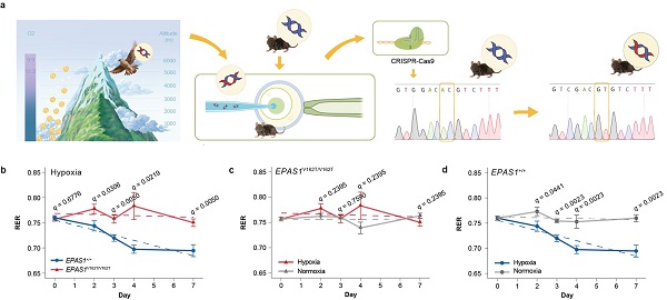 研究運用基因編輯技術首次建立了EPAS1隼型小鼠模型,在模擬慢性低氧環境下,利用呼吸交換率(RER)來探究隼型小鼠在低氧條件下的糖、脂代謝偏向性。低氧處理后,隼型小鼠的RER值在0.75附近隨機波動,而野生型小鼠的RER值顯著降低(脂代謝偏向),說明隼型小鼠在低氧下具有維持糖脂代謝平衡的能力。肝臟轉錄組、代謝組分析印證了隼型小鼠肝具有更好的糖脂代謝調節能力。功能驗證實驗發現突變型EPAS1蛋白活性降低,鈍化了隼型小鼠的低氧反應。此外,研究還分析了行為調節在隼型小鼠糖脂代謝穩態維持中的重要作用。從進化角度看,隼型小鼠維持糖脂代謝穩態在機體應對低氧脅迫時具有重要意義:體重在低氧下可較快恢復,減少體內氧化應激反應,并提高急性低氧下小鼠的存活率。