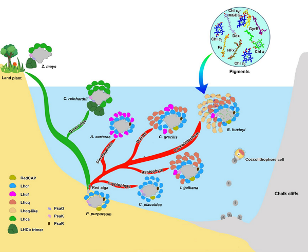 光系統I-捕光天線復合體在光合作用中負責將光能轉化為化學能。由于光合生物對不同光環境的適應性,該復合體在結構和大小上呈現顯著差異。特別是從海岸帶向“陸”和“洋”兩個方向的環境適應過程中,光系統I-捕光天線復合體更是經歷了深刻的演化。顆石藻起源于古海岸帶,于中生代征服遠洋并達到繁盛,對當今全球的氣候和生態意義重大。其中,赫胥黎艾氏藻(Emiliania huxleyi)是顆石藻類群中最著名的模式生物,是海岸帶生物學中的重要研究對象。因此,赫胥黎艾氏藻光系統I-捕光天線復合體光能利用分子機制的研究對于海岸帶生物適應性進化的研究意義非常重大。