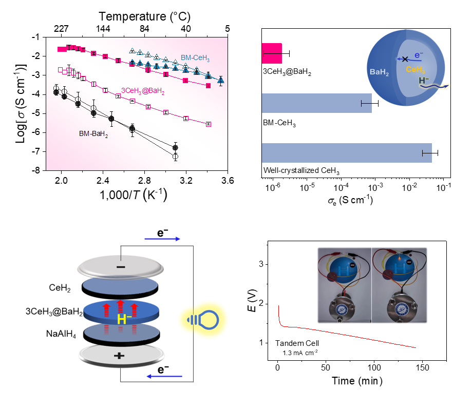 2018年,該團隊啟動氫負離子傳導研究,并于2023年提出了“晶格畸變抑制電子電導”策略,研制出稀土氫化物基低溫超快氫負離子導體(Nature,2023)。在本工作中,為克服上述材料熱穩定性不足的問題,團隊以大帶寬高穩定性的BaH2薄層包覆穩定性較差的CeH3,形成了一種新型核殼結構復合氫化物3CeH3@BaH2,該材料在室溫下即可展現快速的氫負離子傳導特性,并具有優異的熱穩定性和寬的電化學窗口,是一種理想的電解質材料,為全固態電池的研發奠定了基礎。