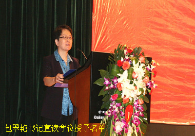 黨委書記包翠艷宣讀了大連化物所2011年研究生學位授予名單暨研究生獲獎名單,并對他們順利畢業表示祝賀。8名學位評定委員會委員為參加典禮的畢業研究生代表頒發了畢業證書。隨后,包翠艷為2011年大連化物所“優秀導師獎”獲得者徐杰研究員、田志堅研究員,“優秀研究生獎”獲得者陳創等10名研究生頒發了獲獎證書。