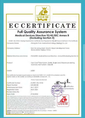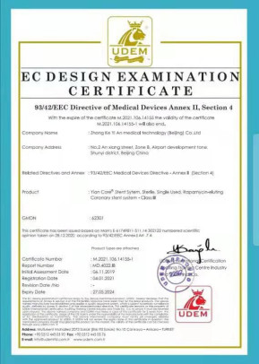 2021年1月4日,由我負責全程研發、中科益安醫療科技(北京)股份有限公司生產的新型心血管支架產品獲得歐盟認證機構頒發的CE證書,取得了進入歐盟國家銷售的通行證書,這將有利于產品在國際市場銷售。